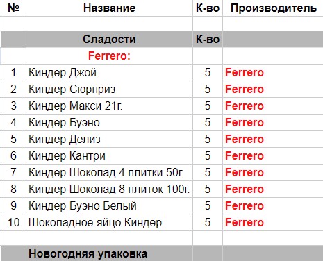 Киндер Джой (5 шт), Киндер Сюрприз (5 шт), Киндер Макси 21 гр (5 шт), Киндер Буено (5 шт), Киндер Делис (5 шт), Киндер Кантри (5 шт), Киндер Шоколад 4 плитки 50 гр. (5 шт), Киндер Шоколад 8 плиток 100 гр.(5 шт), Киндер Буено Белый (5 шт), Шоколадное яйцо Киндер (5 шт)